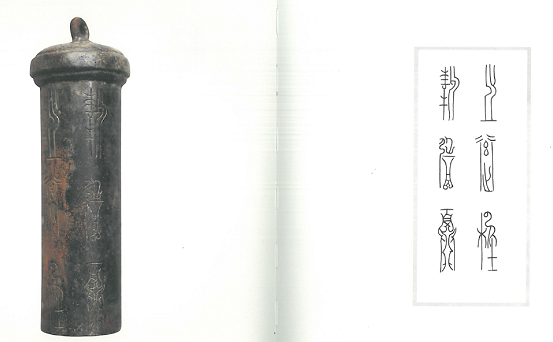 〈新造柲冒〉記有「通高21.7釐米;口徑2.4釐米」,僅言通高,未見(jiàn)帽、鐏的分別長(zhǎng)度,本文藉由附圖,分別丈量其長(zhǎng)度(不包含圓紐),得出比例為7.5:10.8,以比例計(jì)算約得帽8.9釐米、鐏12.8釐米,都比《包山楚墓》三件殳來(lái)得長(zhǎng)(唯《包山楚墓》未見(jiàn)口徑的記錄,無(wú)從比較),可能與「 」字有關(guān)。且「殳」,《說(shuō)文》:「以杸殊人也。《禮》:『殳以積竹,八觚,長(zhǎng)丈二尺,建於兵車,車旅賁以先驅(qū)』」,印證上文提到「 」器與兵事相關(guān)的論述。