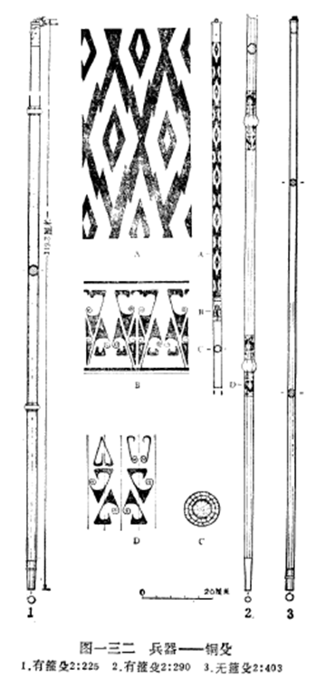 關(guān)於2:225、2:290、2:403的圖形,可參附圖三、四,三器殳與《飛諾藏金》此器相似,唯此器非出土,未知是否存有銅箍;從圖片上看來(lái),其首端的銅帽並無(wú)凸棱周,鐏部則與包山楚墓的殳一樣,存在著凸棱一周,且可能也是八棱之形(從圖片只能看到三棱);銅帽一樣有凸出的圓紐,這圓紐根據(jù)包山楚墓整理者指出2:225號(hào)的圓紐「紐上殘留有一絲帶,結(jié)死結(jié)」[10]的線索,故此器原本應(yīng)該繫有絲帶一類之物。至於此器的長(zhǎng)度,對(duì)照:
