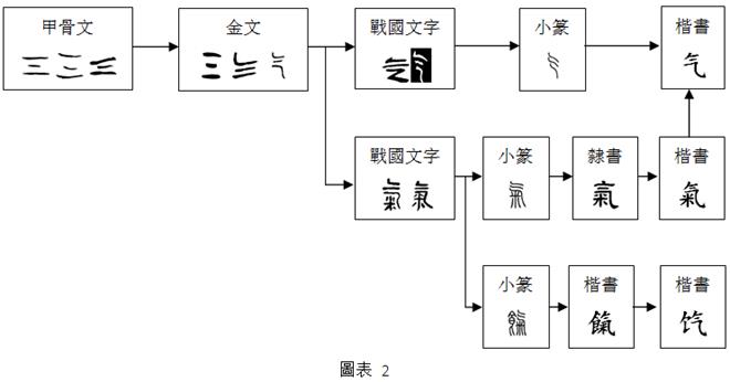 根據(jù)我們的分析,“氣”一開始並沒有“雲(yún)氣”這樣的含義,應(yīng)該是後起的,時間不會晚於《說文解字》所在的漢代,至於具體操作如何,目前還不清楚?,F(xiàn)就目前的資料將“氣”的字形演變列表繪圖[10]如下: