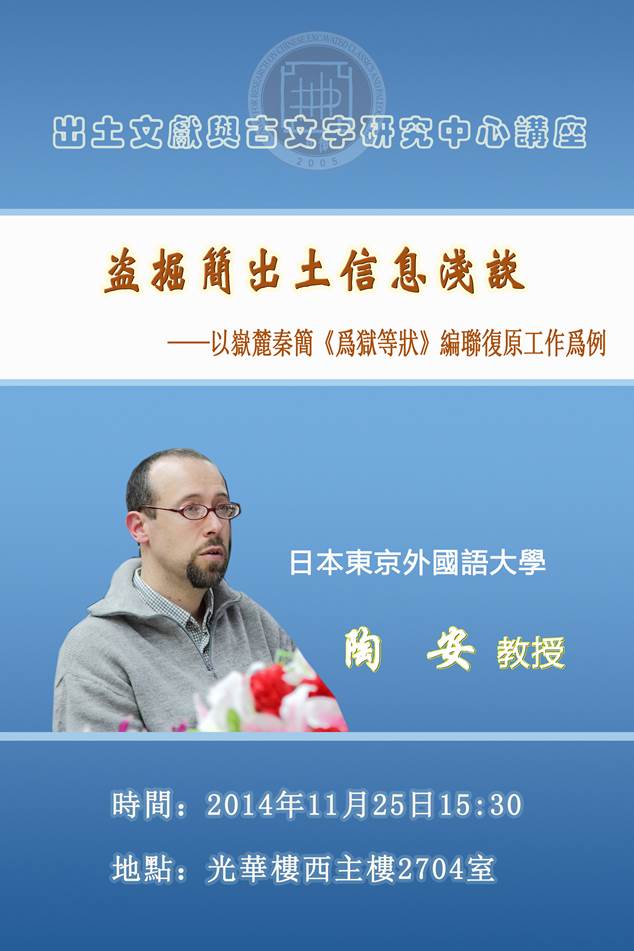 日本東京外國(guó)語大學(xué)陶安教授將於2014年11月25日下午在我中心作題爲(wèi)“盜掘簡(jiǎn)出土信息淺談——以嶽麓秦簡(jiǎn)《爲(wèi)?yīng)z等狀》編聯(lián)復(fù)原工作爲(wèi)例”的學(xué)術(shù)講座。