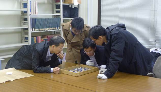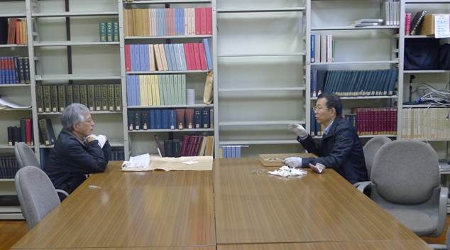 17日,調(diào)研團(tuán)訪問(wèn)京都大學(xué)人文科學(xué)研究所,與武田時(shí)昌教授、淺原達(dá)郎教授及部分所內(nèi)中國(guó)留學(xué)生座談。隨後,在武田先生的帶領(lǐng)下,調(diào)研團(tuán)參觀了京都大學(xué)人文科學(xué)研究所圖書(shū)館館藏圖書(shū)和文物,其中包括甲骨、金文的早期著錄書(shū),羅振玉舊藏、王國(guó)維整理的部分資料,商代車馬器、漢魏晉磚文、銅鏡以及桑原騭藏、內(nèi)藤湖南、梅原末治等先生舊藏部分拓本。