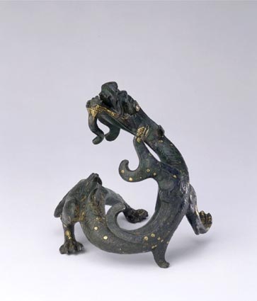 子仲姜盤(pán)上世紀(jì)90年代初見(jiàn)于英國(guó)倫敦文物市場(chǎng)。由中國(guó)文物流通協(xié)調(diào)中心協(xié)調(diào)介紹,香港太陽(yáng)集團(tuán)主席葉肇夫先生斥巨資購(gòu)回。1997年6月捐贈(zèng)于上海博物館。馬承源先生有《跋子仲姜盤(pán)》一文予以介紹說(shuō):“此盤(pán)形制較大,高18厘米,口徑45厘米,體制厚重。盤(pán)外壁飾一曲角形龍,龍首聳出盤(pán)邊,作探水狀。……春秋時(shí)期,盤(pán)中有從飾蟠龍紋改為飾魚(yú)紋的,魚(yú)紋通常沿盤(pán)心外緣,作首尾相貫連狀。如上海博物館所藏鄭伯盤(pán),即是如此?!溟g最為奇怪的,是飾有立體的魚(yú)、青蛙和水鳥(niǎo)等動(dòng)物,都能在原處轉(zhuǎn)動(dòng)360度。這種藝術(shù)裝飾手法上創(chuàng)造性的改變是前所未有見(jiàn)的,不僅使造型單調(diào)的盤(pán)充滿了活躍的生氣和情趣,而且在鑄造技藝上也是一種空前的創(chuàng)造。顯然,子仲姜盤(pán)屬于分鑄技術(shù),但是在較薄的盤(pán)心內(nèi)要嵌鑄一群動(dòng)物,且能做360度的穩(wěn)定轉(zhuǎn)動(dòng),……轉(zhuǎn)動(dòng)的軸在盤(pán)內(nèi)垂直卡住抽不出來(lái)。在合范澆注銅液時(shí),軸和盤(pán)插進(jìn)只能保留一層極薄的泥料在銅液高溫作用之下如何保持泥料敷填物不脫落變形和較薄的盤(pán)心不漏水實(shí)在是高難度的技術(shù)問(wèn)題?!F(xiàn)有無(wú)數(shù)的商周青銅器中難有其匹,這是一件世所罕見(jiàn)的奇物?!?/P>