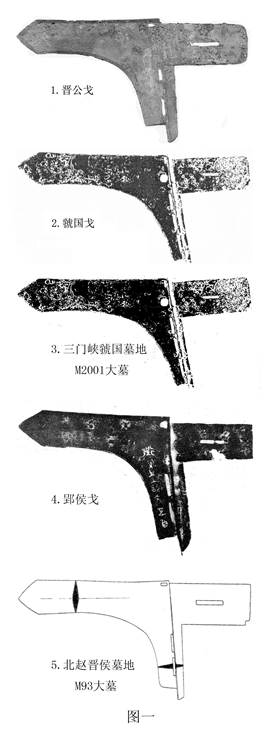 關(guān)于晉公戈的形制(圖一:1),我原來認(rèn)為與虢國墓地戈、欒左庫戈,郢侯戈、秦子戈比較接近。其實(shí),欒左庫戈援部中線起脊,秦子戈三角鋒上翹,援部上緣略彎,都與晉公戈有所區(qū)別,與晉公戈相近的只有50年代發(fā)掘的虢國墓地戈(圖一:2)、郢侯戈(圖一:4)、晉侯墓地M93出土的戈(圖一:5)以及三門峽虢國墓地M2001大墓出土的銅戈(圖一:3)等。郢侯戈的年代上限不早于楚文王都郢的楚文王元年(前689年),下限不晚于楚文王十三年(前677年)。虢國墓地年代以往多認(rèn)為屬西周晚期至春秋早期被晉所滅的前655年。根據(jù)第二次發(fā)掘的M2001虢季大墓出土的小子吉父甗,虢季大墓的墓主應(yīng)是虢公忌父(“父”為衍文)。名忌字吉父、虢公忌死于《左傳·桓公五年》:“虢公林父將右軍”之前。魯桓公五年(前707年)即虢季大墓的年代下限[8]。而虢季大墓出土的銅戈(圖一:3)的形制與晉公戈基本相同。M93以往認(rèn)為是晉文侯之墓。我們重新論證,應(yīng)是晉哀公之墓。墓內(nèi)出土的晉叔家父壺,家父即《左傳·隱公六年》“晉九宗、五正、頃父之子嘉父”,M93的年代下限應(yīng)是前710年[9] 。郢侯戈年代下限前689年。虢季墓戈年代下限前707年,晉哀侯戈年代下限前710年。因此,晉公戈的年代下限應(yīng)是前710~前689年的22年范圍之內(nèi)。