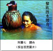 上古時期,壺(參附圖六)主要用於盛酒,亦可盛其它流質(zhì)、半流質(zhì)物,又常用作外出時攜帶飲食的容器[51]?!蹲髠鳌べ夜迥辍罚?SPAN>“昔趙衰以壺飧從,徑,餒而弗食。”《越絕書》卷一:“漁者渡於于斧之津,乃發(fā)其簞飯,清其壺漿而食之[52]。”不過,貴族們用的是青銅壺;而農(nóng)夫漁父所用,則祇能是陶壺或瓠壺(瓠即葫蘆)?!尔}鐵論·散不足》:“古者……庶人器用即竹柳陶匏而已。”《漢書·郊祀志下》:“其器陶匏”,師古曰:“陶,瓦器。匏,瓠也。”《鶡冠子·學(xué)問》:“中河失船,一壺千金”,陸佃注:“壺,瓠也。佩之可以濟(jì)涉,南人謂之腰舟。”今海南黎族尚有此物(參附圖七)。“瓠”可用於渡水,亦可用於盛物?!俄n非子·外儲說左上》:“夫瓠所貴者,謂(為[53])其可以盛也。”“觥飯不及壺飧”本是民間俗諺(韋注:“諺,俗之善語”),“壺”自然也是百姓日常所用之物。在這條諺語中,“觥”指精美的酒器,取其貴而??;“壺”則指陶壺或瓠壺,取其賤而大,故《名義》曰“侊(?。?,小器;壺,大物”。對飢者而言,“觥飯”自然“不及壺飧”。《方言》卷五:“