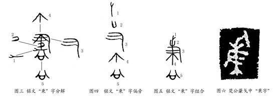 ,從聿,者聲?!惫怒t文[11]和古陶文[12]“書”字均從聿,者聲。與本銘字形不合,釋“書”誤。此字上半部分筆畫怪異,無法隸定。但如果把上半部分筆畫分解以后(圖三、圖四),重新組裝,可以組成秉字(圖五)。組成的秉字與楚國兵器楚公