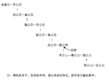 如果不是顛倒黑白,稍微有點實事求是的精神,應(yīng)該承認(rèn)據(jù)上列世系表可知,莊公以前真正弒殺的非自然傳承只有三次。一次是魏公殺幽公。一次是伯御殺叔父懿公。一次是桓公殺其兄隱公。魏公為什么要殺幽公,不見于記載,但從謚稱中可以窺見其真相。《逸周書·謚法解》:“動祭亂常曰幽?!保钻俗ⅲ骸耙咨裰唷!迸苏裨疲骸芭e動祭祀而亂常位,如逆祀是已。幽者,謂其不明禮也?!敝煊以疲骸皠屿o亂常,言起居無節(jié),號令不時?!?span>)“克威捷行曰魏,克威惠禮曰魏”。(劉師培云:“《通考》‘惠’作‘順’?!笨钻俗ⅲ骸坝型粜??!迸苏裨疲骸拔?,高也。”陳逢衡云:“《方言》:‘魏,能也?!敝煊以疲骸拔捍笠病!阂粑?。”)[30]幽公很可能是祭祀時隨意變動神主的位次?;蛘呤怯捎跊]有按照“四時”的規(guī)定發(fā)布號令。觸犯了某些禮制規(guī)定而被殺的。而魏公則是由于迅速、敏捷的能夠“惠(順)禮”即糾正理順了被幽公擾亂禮制的錯誤言行而被謚為“魏”的。魏公殺幽公即使不是受命于周王朝,至少也是周王朝所認(rèn)可的。因而不像伯御殺懿公那樣受到周王朝的干涉。而伯御殺懿公是破壞一繼一及制的篡位,是真正的非自然傳承。周宣王出面干涉,伐魯殺伯御,立懿公弟孝公,恢復(fù)了一繼一及繼承秩序。正因為周宣王維護(hù)了周公創(chuàng)立的一繼一及制,史稱“法文、武、成、康之遺風(fēng)”(《周本紀(jì)》)。是“宣王中興”的一個具體實例。至于桓公殺兄隱公,則是聽信野心家公子揮的讒言,弒殺原本想實行一繼一及制傳位其弟桓公的搶班奪權(quán),雖屬非自然傳承,但卻不能作為抹殺論者的借口。