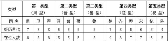 楚、齊、秦宋四國西周世系與周型三國相類似。杞、陳二國西周世系則與晉型三國相類似。為使眉目清楚,茲列出西周各國世系經(jīng)歷世代與在位國君人數(shù)對照表: