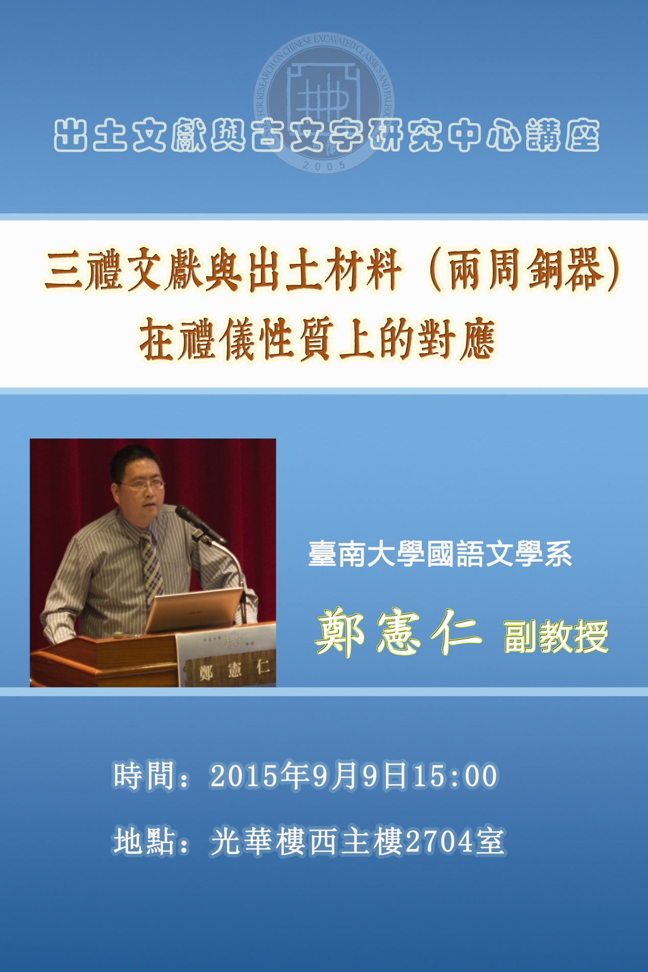臺南大學國語文學系鄭憲仁副教授將於2015年9月9日15:00在光華樓西主樓2704室作題爲“三禮文獻與出土材料(兩周銅器)在禮儀性質上的對應”的學術講座。