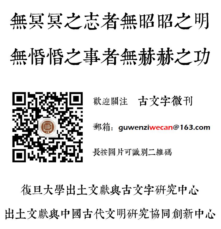 “古文字微刊”(微信ID:guwenziwecan)由復(fù)旦大學(xué)出土文獻(xiàn)與古文字研究中心2014級(jí)博士研究生郭理遠(yuǎn)申請開通於2014年4月,從2014年9月30日起正式開始推送消息。到現(xiàn)在爲(wèi)止,已經(jīng)運(yùn)行一年,吸引了大批本專業(yè)研究人員及普通愛好者的關(guān)注,現(xiàn)有關(guān)注人數(shù)已經(jīng)突破六千。自2015年9月28日起,本微刊改由復(fù)旦大學(xué)出土文獻(xiàn)與古文字研究中心官方運(yùn)營。