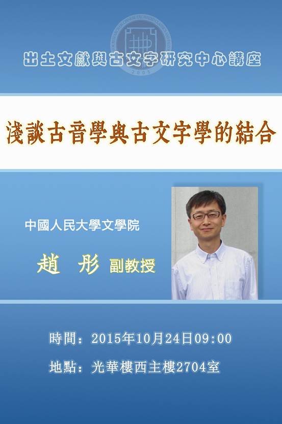 中國(guó)人民大學(xué)文學(xué)院趙彤副教授將於2015年10月24日09:00在光華樓西主樓2704室作題爲(wèi)“淺談古音學(xué)與古文字學(xué)的結(jié)合”的學(xué)術(shù)講座。