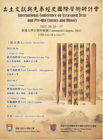 香港大學(xué)中文學(xué)院主辦、香港中文大學(xué)歷史系中國(guó)歷史研究中心協(xié)辦之「出土文獻(xiàn)與先秦經(jīng)史國(guó)際學(xué)術(shù)研討會(huì)」已於2015年10月16-17日在香港大學(xué)百周年校園召開。會(huì)議為期兩天,以出土文獻(xiàn)與先秦經(jīng)、史研究的關(guān)係作為主題,來自美國(guó)、歐洲、日本、新加坡、臺(tái)灣、中國(guó)內(nèi)地、香港等的學(xué)者發(fā)表共約60篇論文,就出土文獻(xiàn)的研究提出重要的意見,現(xiàn)場(chǎng)討論氣氛熱烈。
