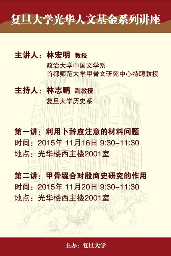 由復(fù)旦大學(xué)歷史系林志鵬副教授主持、臺灣政治大學(xué)中國文學(xué)系林宏明教授主講的“復(fù)旦大學(xué)光華人文基金系列講座”將於2015年11月下旬在光華樓西主樓2001室正式開講,具體講座信息見下圖。