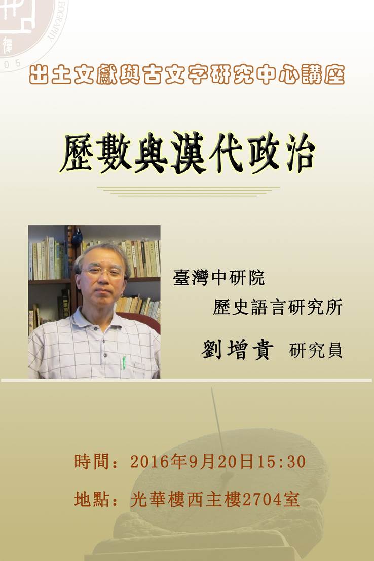臺灣中研院歷史語言研究所劉增貴研究員將於2016年9月20日15:30在光華樓西主樓2704室作題爲“歷數(shù)與漢代政治”的學(xué)術(shù)講座。