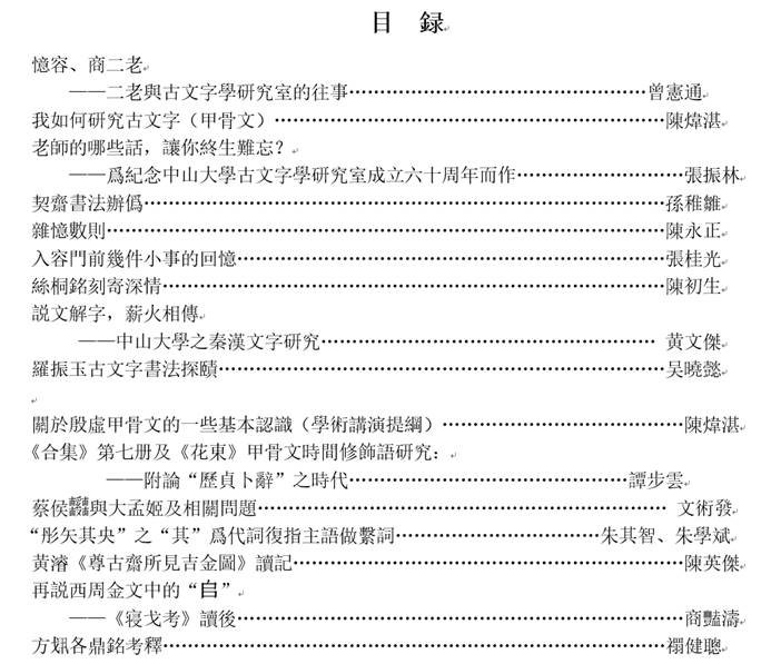 早在去年夏天,曾師經(jīng)法先生就説過,今年是中山大學(xué)古文字學(xué)研究室成立六十周年,建議《古文字論壇》以此爲(wèi)專題,出一個(gè)紀(jì)念專輯。時(shí)間緊迫,組稿工作迅速開展,可喜的是,容、商弟子及再傳弟子、三傳弟子、四傳弟子踴躍撰稿,使得《論壇》稿件如期集齊。曾師在中大學(xué)習(xí)和工作長(zhǎng)達(dá)六十餘年,是研究室建設(shè)和發(fā)展的親歷者和見證人,身體力行,寫了長(zhǎng)篇文章《憶容、商二老》,還原了許多歷史場(chǎng)景。陳煒湛先生正值寓所加建電梯,強(qiáng)忍周遭的嘈雜不堪,重新修訂了《我如何研究古文字(甲骨文)》和《關(guān)於殷虛甲骨文的一些基本認(rèn)識(shí)》二文。張振林先生因電腦問題收到邀稿函較遲,也都趕在出版社截稿前送來大作《老師的哪些話,讓你終生難忘》。孫稚雛先生因患眼疾,封刀已久,此番慨然應(yīng)約,重出江湖,針對(duì)社會(huì)作僞成風(fēng)之弊,專論商老書法之辨僞。陳永正先生寫了《雜憶數(shù)則》一文,最早將稿子送來。張桂光先生在萬忙之中撥冗寫了《入容門前幾件小事的回憶》。陳初生先生爲(wèi)紀(jì)念容、商二老,曾用心製作三把古琴,命名爲(wèi)“康樂清風(fēng)”、“希白”和“錫永”,且撰有琴銘,親自書寫鐫字,如今將所撰琴銘謄抄一遍,題爲(wèi)《絲桐銘刻寄深情》交《論壇》發(fā)表,可作書法精品視之。我們看到了容、商弟子對(duì)師恩的深切緬懷,並未因歲月流淌而有些許褪色,反而益加醇厚濃烈。諸位師長(zhǎng)的懷舊文字,自有學(xué)術(shù)史料價(jià)值在。古文字室的地址,從東區(qū)大球場(chǎng)邊上的中大文物館二樓(今址“保衛(wèi)處”),再到中區(qū)榮光堂南側(cè)的小平房,再到數(shù)學(xué)樓二樓,再到馬岡頂東北區(qū)十八號(hào),又搬到郁文堂二樓和八樓,再到中文堂的五樓,尋尋覓覓,六十春秋六度播遷,培養(yǎng)了許多人才,鑄造過輝煌,經(jīng)受過蕭條,可寫的東西實(shí)在太多了,能寫的人也真不少,如繆錦安、劉雨、楊五銘、唐鈺明、黃光武、陳抗、劉昭瑞、趙平安、劉樂賢、張連航……等等師友,這次因種種緣由而未能賜稿,給我們留下了不小的遺憾。