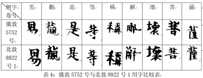 (薩)”與后者首行頂端的“名號(hào)”相連成句,文意完整。且二號(hào)行款相同(半葉5行,行約7字,行間距相等、字間距及字體大小相近),書(shū)風(fēng)相似,字跡似同(比較二號(hào)皆有的“男”“觀”“是”“等”“稱”“解”“壞”“菩”“薩”字,參表4)。據(jù)此判斷,此二號(hào)確為同一寫(xiě)本之脫落,可綴合為一。將俄敦5752V號(hào)2、俄敦5752號(hào)正面與此二號(hào)綴合后,所存內(nèi)容起“稱觀世音菩薩□(名)者”,訖尾題“佛說(shuō)觀音經(jīng)一卷”。相應(yīng)文字參見(jiàn)《大正藏》T9/56C16-58B7。