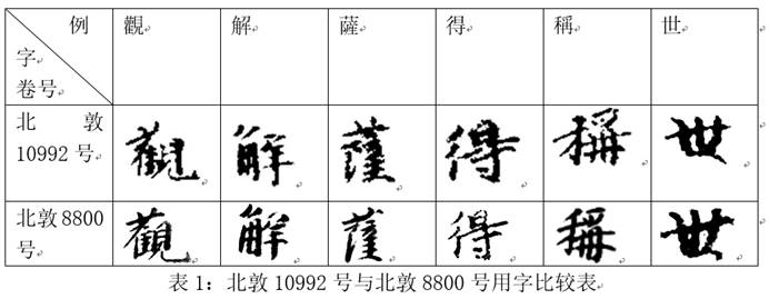 按:《國(guó)圖》已指出北敦8800號(hào)+北敦8803號(hào)+北敦8792號(hào)+北敦8799號(hào)+北敦8813號(hào)+北敦9138號(hào)+北敦9137號(hào)+北敦8814號(hào)+北敦8809號(hào),今謂北敦10992號(hào)亦可與此九號(hào)綴合。綴合后如圖2所示,北敦10992號(hào)背面末行底端的“入”與北敦8800號(hào)正面首行頂端的“于大?!毕噙B成句,文意完整。又二號(hào)均為梵夾裝,北敦10992號(hào)正面右上有序號(hào)勘記“一”字,而北敦8800號(hào)正面右上有序號(hào)勘記“二”,正說(shuō)明此二號(hào)前后銜接,另外七號(hào)梵夾裝寫(xiě)本上亦存有序號(hào)勘記“四”至“十”,可資比勘。且二號(hào)行款相同(半葉5-6行、行約17字、楷書(shū)、行間距相等、字間距及字體大小相近),書(shū)風(fēng)相似,字跡似同(比較二號(hào)皆有的“觀”“解”“薩”“得”“稱”“世”字,參表1),據(jù)此判斷,此二號(hào)確屬同一寫(xiě)本之脫落,可綴合為一。十號(hào)綴合后,所存內(nèi)容起首題“妙法蓮華經(jīng)觀世音菩薩普門(mén)品第廿五”,訖“尋聲自回去”。相應(yīng)文字參見(jiàn)《大正藏》T9/56C2-58A9。