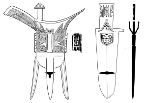 ”爵(M15:3)與殷墟范家莊M4出土銅爵(M4:8、10)形制相同,腹部所飾饕餮紋略有差異,后者時(shí)代為殷墟青銅器第二期晚段[22]?!?span>![]()