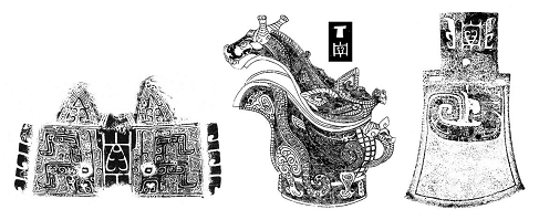 ”?。ㄒ笾?span>09256,商周13618)為橢圓形腹,口微侈,寬短流,獸首鋬,鼓腹圈足,蓋的前部作龍首形,后部作豎耳獸面,中部有脊,飾夔紋,腹部飾夔紋和龍爪,通體以云雷紋襯底,內(nèi)底鑄“![]()