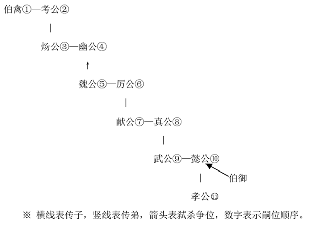 把宣王立孝公說成是非自然繼承,也是不對的。詩言“普天之下,莫非王土,率土之濱,莫非王臣”(《詩·小雅·北山》)。周王朝號稱天下共主,又是魯國的宗主國。不僅立國君要經(jīng)過周王朝的同意,即使是立太子也要經(jīng)過周王朝的認(rèn)可。魯武公率長子括和少子戲去朝見宣王。宣王立少子戲為太子即懿公,是其證。魯人殺懿公,立長子括的兒子伯御為君。由于是破壞一繼一及制的篡位,沒有得到周王朝的認(rèn)可。盡管已經(jīng)在位11年,最終結(jié)果還是被周宣王所殺(《國語·周語上》《魯世家》)。宣王立懿公弟孝公,恢復(fù)了一繼一及的繼承制度。非法繼承君位的是伯御,怎能把宣王立孝公視為非正常傳承呢?