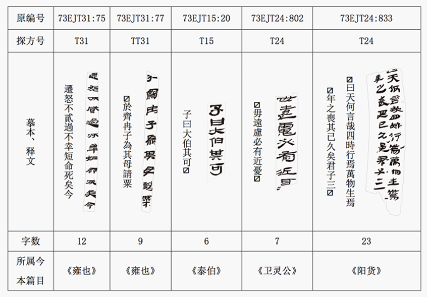 表1所示肩水金關(guān)漢簡中的《論語》簡牘,是今本《論語》中《雍也第六》、《泰伯第八》、《衛(wèi)靈公第十五》、《陽貨第十七》諸篇中的章句。除前二十篇中的章句外,還有第二十二篇《知道》的首章。從肩水金關(guān)所出紀(jì)年簡來看,以“(漢)宣帝時期的最多”[10],這一時期正是《齊論》的傳播年代。筆者以為,肩水金關(guān)漢簡中的《論語》,當(dāng)是《齊論語》。
