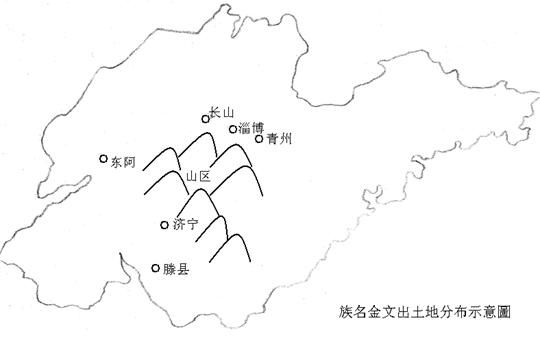 ,舟父戊爵)。通過地圖(如下所示),我們發(fā)現(xiàn)這一系列地名是有聯(lián)繫的。青州、長山、淄博處在山東北部的同一區(qū)域;滕縣、泗水、東阿處在山東西南的同一區(qū)域。這一串地名又貼著山東中部的泰山山脈,沿著山脈的輪廓,在山區(qū)周圍的平坦地帶排開。