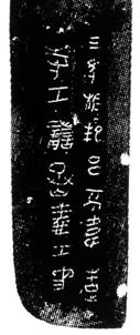 此爲(wèi)秦始皇陵兵馬俑坑一號坑出土三年相邦呂不韋戟(T10G6:0577)戈內(nèi)正面銘文,[1]同坑所出尚有銅鈹16件,其中與此戈工匠名相同的9件,分別是十五年鈹2件、十七年鈹6件、十八年鈹1件。[2]