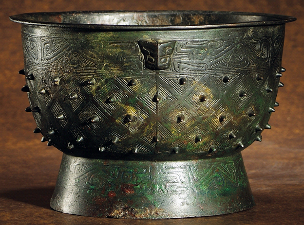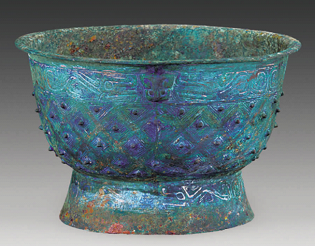 西泠印社二零一七年秋季拍賣會(huì)中國(guó)歷代青銅器專場(chǎng)中有一件珍貴的拍品德師盂,圖錄編號(hào)為615,通高16.4釐米,系民國(guó)時(shí)期駐華大使司徒雷登(John Leighton Stuart)舊藏?!端就嚼椎桥f物-青銅德師盂小析》對(duì)這件銅器進(jìn)行了初步的研究,青銅盂平唇口沿,深腹,近底內(nèi)斂,下有高圈足外撇。頸部有高浮雕龍首,雙角折捲,占整個(gè)頭部一半。兩目呈“臣”字形,嘴部簡(jiǎn)化。以龍首為中心,對(duì)稱分佈浮雕爬行龍紋,頭部相對(duì),上頂尖角,下有一小足。背部躬起,尾部岔分兩向,其一前勾捲曲,另一蜿蜒至地復(fù)又內(nèi)捲。腹部裝飾百乳雷紋,亦稱斜方格雷乳紋,鼎、簋和罍的腹部常以之為主要紋飾。圖案呈斜方格,每一格邊緣作雲(yún)雷紋,中間有一乳突。百乳雷紋盛行於商代中期、晚期直到西周早期。商代的乳突圓潤(rùn)平坦,西周的則長(zhǎng)而尖銳。高圈足上裝飾三組對(duì)稱的爬行龍紋,造型與頸部相同,只是沒(méi)有高浮雕龍首。盂紋飾較淺,顯然經(jīng)歷了大範(fàn)圍的除鏽,器身變得纖薄。光亮的皮殼,當(dāng)是燙蠟所致。容庚在《商周彝器通考》中記載:“乾嘉以前出土之器,磨礱光澤,外敷以蠟?!贝朔墒骨嚆~器更好地保存,流程即將古銅器先行清洗,用酸梅膏糊清除銅銹,後用獸皮打磨表面,拋光以後塗臘保護(hù)。而盂的底部,保留了原始的銹色,層次豐富,沁沒(méi)入骨。這種部分清理的現(xiàn)象,見於晚清民國(guó)時(shí)期[1]。