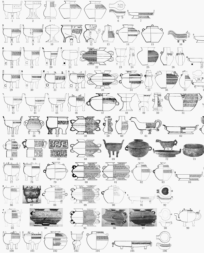 1-7.光山寶相寺1983MG1A1、A3A5、A7、A8、A10、A9  8-17.光山寶相寺1983MG2(A1、A2A8、A4、A6A14、A10A3、A13、A12)  18-28.洛陽西工區(qū)2005M88365146、5461、44、47+53、5943、4262、41 29-42. 洛陽西工區(qū)2005M883231、511、18、13、2、7、15、1225、17、3926  43-54.海陽嘴子前1994M471、7294、9078、80、8791、73、133、95132  55-64.滕州薛故城1978M162、67、70、7652、6357、561、67  65-68.商水朱集1975M(噩仲簋、蟠螭紋簋·紋飾、原仲簠)  69-76.洛陽中州路1954M241547、8、9、5、78、9  77-85.襄陽沈崗2009M102212、7、3、4、5、68、9  86-92.淅川下寺1979M767、89、3、21  93-99.淅川下寺1979M88、1、43、2、56  100—106.南陽李八廟2004M112、5、34、6、7