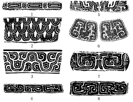 1.重環(huán)紋(M2001:130 2.垂鱗紋(M2001:390  3.波帶紋(M2006:5  4、8.竊曲紋(M2011:8564  5、6.鳥紋(M2001:90  7.龍紋(M2011:40