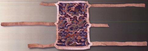 這件縑織物顯然也是“韝”。從其被繫紮在墓主人左臂上這一點,也可以說明其用途。該縑織物質料和形制與上邊介紹的尼雅遺址出土的“韝”非常接近,只是左右兩邊的繫帶是兩條而不是三條。