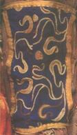 一件為1995年10月出土于新疆民豐縣尼雅遺址(漢代精絕國遺址)的一座夫婦合葬墓(95MNIM8)中。[1]該墓葬時代約相當於東漢末到魏晉時期。墓中男屍右側隨葬弓矢等物,其旁還出土一幅被發(fā)掘者稱為“護膊”的織錦(見圖三)。該“ 織錦”作長方形,幅長18·5、寬12·5釐米,四周以白色絹布鑲邊,左右緣各連綴三條黃白色絹帶,長約21釐米??楀\色澤豔麗,圖案中有孔雀、鴕鳥、辟邪、獅子等動物形象,並用漢字織出“五星出東方利中國”的文字穿插於圖案之間。[2]發(fā)掘者推測其用途是“引弓者護膊之物”,是非常正確的,但其名稱,其實應該按古代的稱呼稱之為“韝”。該織錦經鑒定被認定是漢代的蜀錦,宋方嶽《秋崖集》卷十五《閱視賞射》詩謂:“邊角悲鳴霜撲地,將校甯甘潑寒戲,熊旗引隊柳營曉,大羽插腰生意氣,虎皮半卷並鐵刀,臂鞲蜀錦團鵰袍,士不敢喘那敢驕,肅聽號令惟所操。 ”可見在宋代,還有用蜀錦製作“韝”的習慣。