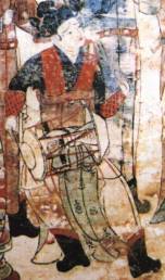 該婦女身著圓領小袖長衣,腰佩承露囊,手捧一圓盤,手臂上戴著繡有花紋圖案的“韝”。該“韝”比一般的韝要小,推測很可能就是所謂的“半臂韝”。