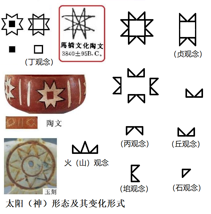 文字的原始基礎(chǔ)用現(xiàn)代理論概念來說,屬于《形態(tài)構(gòu)成》,是在整體(具體形態(tài))觀念形象基礎(chǔ)上的分解變形與提?。ǔ橄笮螒B(tài)),進(jìn)而會意重組構(gòu)成表達(dá)觀念意義的形態(tài)構(gòu)成(文字)。丙即如此而來,是最基礎(chǔ)的文字之一,其的本義就是炳,即《說文解字》釋炳:明也。其原始來源于先古人對太陽及其火光的擬構(gòu),這可以從仰韶文化陶器刻劃標(biāo)識當(dāng)中看的很清楚。后世丙字形的發(fā)展變化與相關(guān)的文字義皆產(chǎn)生在此基礎(chǔ)之上,這包括具體(類似形態(tài))實物。