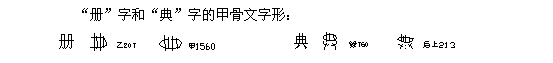 在甲骨文里出現(xiàn)了“冊”字,其字形就象編連在一起的竹簡,這顯示殷代除用甲骨來承記文字外,確實也用簡來作文字的載體;《尚書.多士》中有“惟殷先人,有冊有典”的記載可證。“典”字的甲骨文字形,是雙手捧著冊(錄760,后上21.3)。