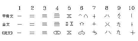 在《中國大百科全書.數(shù)學》[1]“記數(shù)法”條下,介紹了中國古代的記數(shù)法?,F(xiàn)在所知的中國最早的記數(shù)符號體系見于甲骨文,約形成于公元前16-11世紀。甲骨文里的數(shù)碼是十進位非位值制數(shù)系,獨立的符號共發(fā)現(xiàn)了十三個,甲骨文、金文和《說文》里關于數(shù)的記錄書寫符號分別如下:[3]