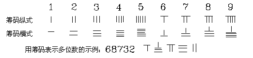 甲骨文里的記數(shù)采用一種特別的乘法組合規(guī)則,將十、百、千、萬作為單位詞,對十以上的數(shù)字多用合文來寫,例如五百、四千、三萬等等。在籌算法產(chǎn)生以后,為避免在算板上相鄰兩位數(shù)的籌策混淆在一起,采用了縱橫有別的兩種籌式: