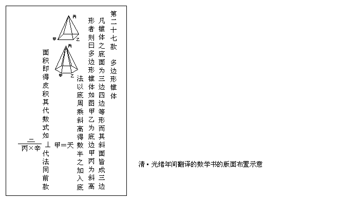 。當數(shù)學上的橫排行文方式與漢文的傳統(tǒng)豎排方式發(fā)生矛盾時,數(shù)學領域的小范圍習慣服從了社會文化的大傳統(tǒng)——行文方式采用豎排,而文中的籌式數(shù)碼占用多個豎行位置來橫排,這種版面格式可見朱世杰《四元玉鑑》的木刻版本([4] P293)。陜西省圖書館古籍部藏清代光緒丁酉年間刻印的《算式輯要》,由英國傅蘭雅口譯,元和江衡筆述,哈司韋輯錄,長沙影珠山廬劉氏家藏,筆者用現(xiàn)代CAD技術(shù)將書里一段敘述幾何問題,計算棱錐體表面積的版面布置模仿轉(zhuǎn)繪如下面框圖內(nèi)。