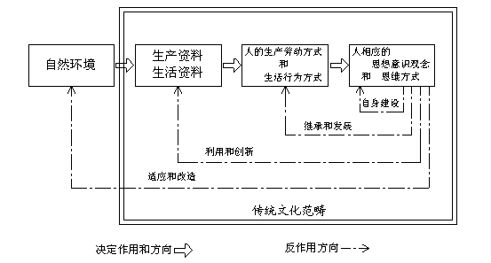 通過對竹文化的研究,可以歸結(jié)出如圖二所示的一個關系。在我們的民族形成之初,自然環(huán)境條件給予我們祖先的物質(zhì)資料種類和形態(tài),決定了我們祖先的生產(chǎn)活動和生活行為方式,形成了生產(chǎn)勞動和物質(zhì)生活的種種習慣,這些行為方式和習慣又經(jīng)過歷代的繼承發(fā)展和推論演繹,形成為一定的風俗、傳統(tǒng),即一定的文化現(xiàn)象。
