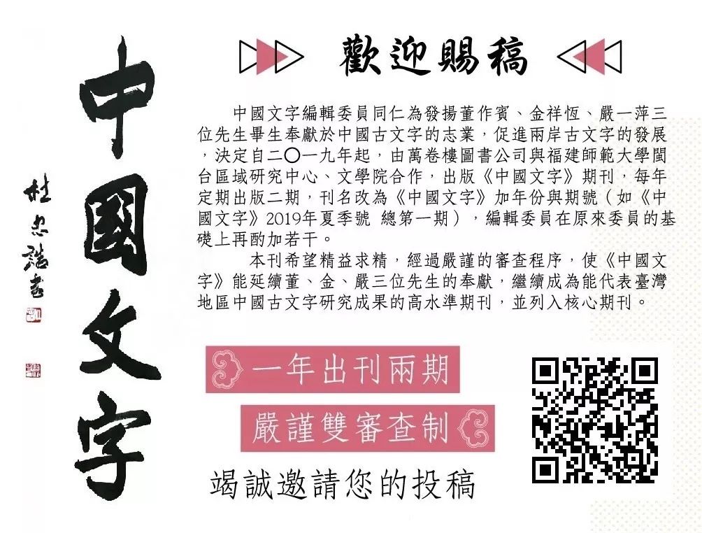 《中國文字》並長期徵集文字學相關領域論文,延請文字學重要學者、專家審查,實施嚴謹的雙審查制度,敬請相關領域學者與研究者不吝賜稿!