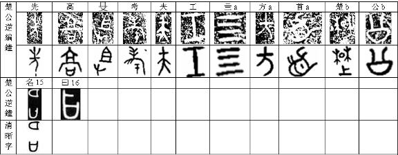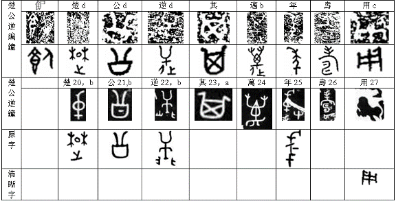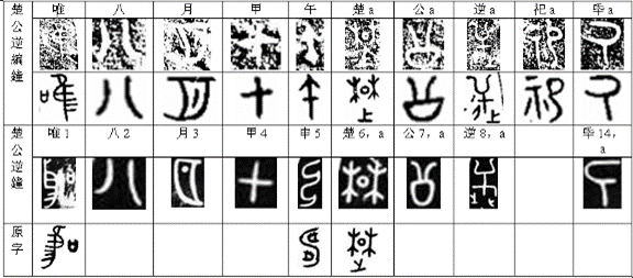 (2)、原字摹誤的在“原字”欄出校,字形來源辦法詳下文;“原字”并非說我們提供的就是楚公逆鐘銘文字形的原樣,而是就目前的楚系銅器銘文資料提供較為接近的字形,下述“清晰字”亦然;