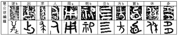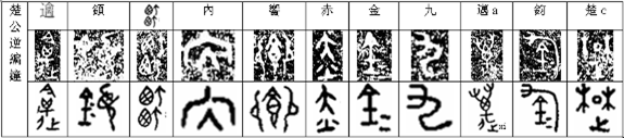 (4)、因字形對比需要,在楚公逆鐘銘文單字排列不一定按原來順序,為了不致混亂,在釋文單字後以數(shù)字標(biāo)示該字在銘文中的次序;為統(tǒng)計(jì)各篇銘文中同一單字出現(xiàn)的頻率,以類比字形,在同篇銘文中出現(xiàn)兩次以上的單字後以a、b、c……標(biāo)示,如楚20,b,表示該字是此篇銘文中第20字,在此篇銘文中第2次出現(xiàn),楚d,表示該字在此篇銘文中是第4次出現(xiàn);