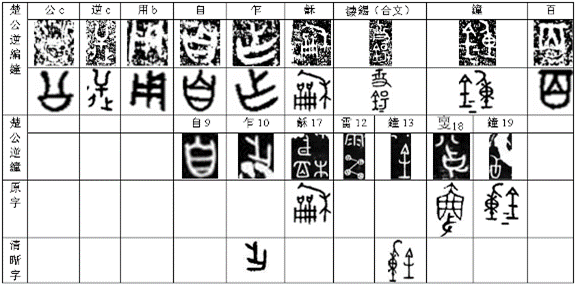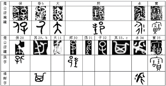 (3)、原摹寫大致不誤而字形尤為不清晰者,儘量以同篇銘文中清晰字形在“清晰字”欄出校,同篇銘文中無此字者,則以楚公逆編鐘字形最為接近者拓本出校,否之則以楚系銅器銘文中字形最為接近者出校;