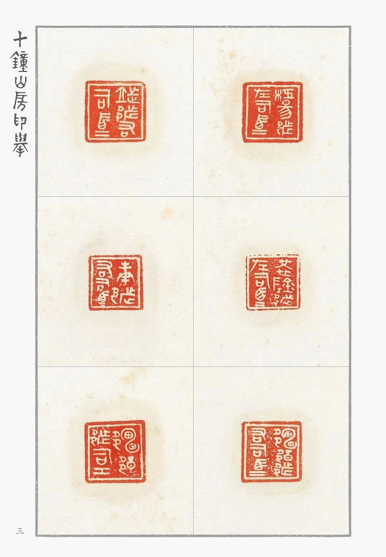 前者,因譜成之時爲同治十一年(壬申),故以“壬申本”名之。“壬申本”有“壬一本”及“壬二本”之分。“壬一本”每冊首頁正文署“十鍾山房印舉”題名,次行署“同治壬申海濱病史六十歲作”字樣。用粵紙製作,世稱“廣紙本”。印稿用紙光滑,紙色微黃,因鈐拓時印泥油較重,引致朱文較肥,白文較瘦。“壬二本”印稿紙以吳中六吉棉連紙製作,世稱“蘇紙本”,此本亦於每冊首頁正文署“十鐘山房印舉”題名,次行署“同治壬申海濱病史六十歲作”字樣,印稿紙爲白棉料所製,板框較“壬一本”略短狹一二分。“蘇紙本”紙張與印泥配合得宜,因此較能保存原印字形。上述兩種均稱“壬申本”。其一至六冊録古璽印336方;七至十三冊録周秦印597方;十四至二十五冊録官印1004方;二十六至四十二冊録六面、兩面印及象形印754方;四十三至四十四冊録姓名印200方;四十五冊録印信印98方;四十六至四十八冊録臣名印244方;四十九冊録吉語印62方;五十冊録長方印47方,總録印璽3342方。