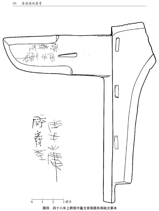 圖三 廿七年上郡守趞戈器形與戈內(nèi)正面銘文拓本與摹本、戈內(nèi)背面銘文摹本/152