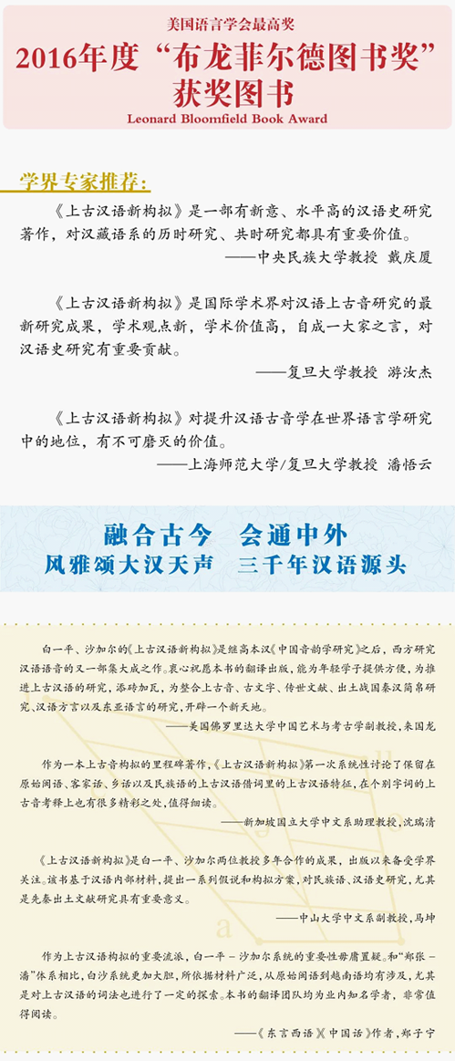美國(guó)密西根大學(xué)白一平(William H. Baxter)教授和法國(guó)巴黎國(guó)立東方語(yǔ)言文化學(xué)院沙加爾(Laurent Sagart)教授合著的Old Chinese: A New Construction(中譯本《上古漢語(yǔ)新構(gòu)擬》)是一部關(guān)於上古音研究的集大成的著作。2014年該書由牛津大學(xué)出版社出版。該書出版後,受到中外學(xué)界的廣泛關(guān)注,隨即榮獲2016年度美國(guó)語(yǔ)言學(xué)會(huì)(Linguistic Society of America)的“布龍菲爾德圖書獎(jiǎng)”(Leonard Bloomfield Book Award)。