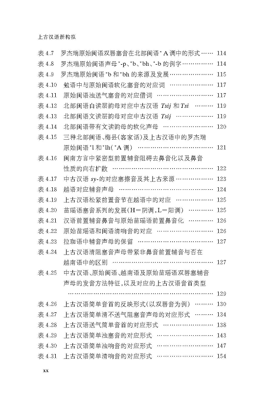 美國(guó)密西根大學(xué)教授白一平(W.H.Baxter)和法國(guó)東亞語(yǔ)言研究所教授沙加爾(L. Sagart)所著的《上古漢語(yǔ)新構(gòu)擬》(Old Chinese:A New Reconstruction)從音節(jié)結(jié)構(gòu)的角度入手,分聲母、韻母、聲調(diào)等幾個(gè)大的方面,詳細(xì)闡述了作者對(duì)上古音問(wèn)題的見(jiàn)解。在材料運(yùn)用方面,將漢語(yǔ)內(nèi)部材料(如諧聲字、通假字、出土文獻(xiàn)、古文字等)和外部材料(苗瑤、侗臺(tái)、藏緬等民族語(yǔ))相結(jié)合,重視以現(xiàn)代漢語(yǔ)方言作爲(wèi)佐證,特別吸收了羅傑瑞對(duì)於“原始閩語(yǔ)”的構(gòu)擬。該書探討上古音,不僅關(guān)注音韻問(wèn)題本身,還將歷史形態(tài)學(xué)的分析與上古音研究聯(lián)繫起來(lái),發(fā)現(xiàn)和提出各種前置輔音的語(yǔ)法功能。