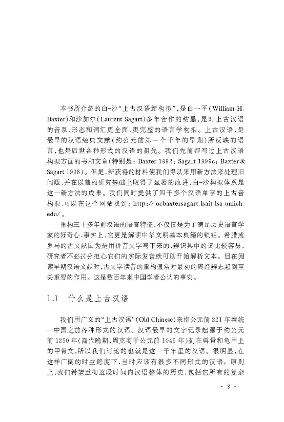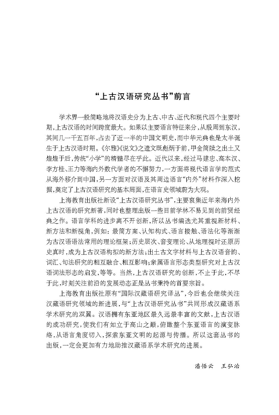 我們希望我們的翻譯工作能給中文學(xué)界,尤其是爲(wèi)研究漢語(yǔ)古文字、漢語(yǔ)方言和其他東亞語(yǔ)言的年輕學(xué)子學(xué)習(xí)白、沙兩位先生這本著作提供方便。正如兩位先生在本書中指出的那樣,以上古音爲(wèi)基礎(chǔ)的上古漢語(yǔ)的綜合研究才剛剛起步。我們衷心祝願(yuàn)本書的翻譯,能爲(wèi)我們共同推進(jìn)上古漢語(yǔ)的研究添磚加瓦,爲(wèi)綜合上古漢語(yǔ)、古文字學(xué)、戰(zhàn)國(guó)秦漢簡(jiǎn)帛研究、漢語(yǔ)方言以及東亞語(yǔ)言的研究開(kāi)闢一個(gè)新天地。