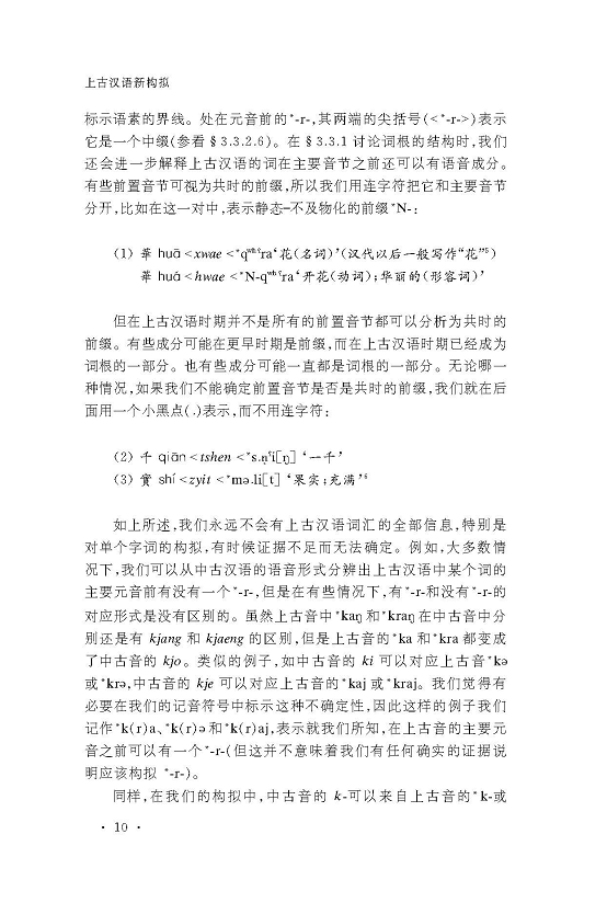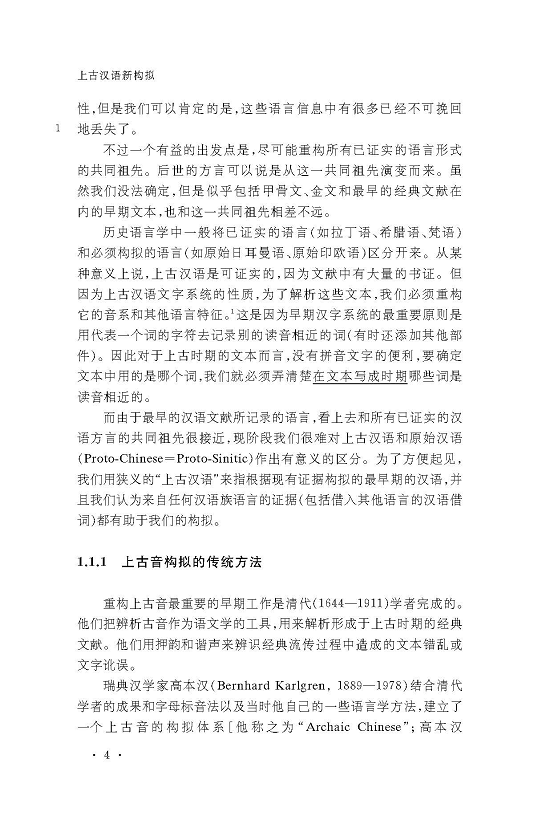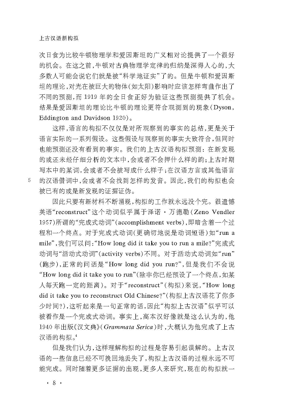 我們的《上古漢語(yǔ)新構(gòu)擬》問(wèn)世至今已經(jīng)四年了,現(xiàn)在我們非常欣喜地看到上海教育出版社、香港浸會(huì)大學(xué)饒宗頤國(guó)學(xué)院聯(lián)合香港中華書局,將在內(nèi)地和香港兩地同時(shí)出版《上古漢語(yǔ)新構(gòu)擬》的中文簡(jiǎn)體、繁體版。如果中國(guó)的語(yǔ)言學(xué)研究者對(duì)本書中的許多新見(jiàn)解感到意外,我們並不會(huì)特別吃驚。我們期待著中國(guó)同行的反應(yīng),希望中國(guó)的同行能從各個(gè)不同的角度對(duì)我們的上古音構(gòu)擬提出具有深度和建設(shè)性的討論意見(jiàn)。正如書中所明言,我們並不認(rèn)爲(wèi)我們的構(gòu)擬系統(tǒng)是對(duì)上古漢語(yǔ)語(yǔ)音、形態(tài)和詞彙諸方面研究的定論,“新構(gòu)擬”從本質(zhì)上說(shuō)是對(duì)迄今尚未得到解釋或者尚未得到充分解釋的語(yǔ)言事實(shí)所作的一系列假設(shè)。
