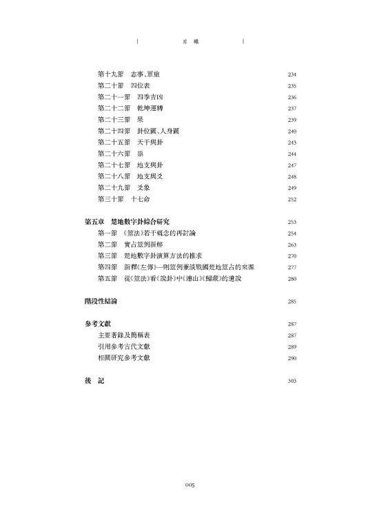 第三章第一節(jié)“數(shù)字卦研究學(xué)術(shù)簡史”:《出土數(shù)字卦材料研究綜述》,《中國史研究動 態(tài)》2014年第4期。第三章第二節(jié)“數(shù)字卦的分類與用數(shù)體系的推擬”:《試論出土數(shù)字卦材料的用數(shù)體系》,《周易研究》2014年第6期。第三章第三節(jié)“數(shù)字卦與易學(xué)思維”:《數(shù)字卦的名稱概念與數(shù)字卦中的易學(xué)思維》,《管子學(xué)刊》2016年第1期。第五章第二節(jié)“實占筮例新解”:《清華簡〈筮法〉與楚地實占筮例分析》,《簡帛研究二〇一五(春夏卷)》,桂林:廣西師范大學(xué)出版社,2015年。第五章第三節(jié)“楚地數(shù)字卦演算方法的推求”:《清華簡〈筮法〉與楚地數(shù)字卦演算方法的推求》,《深圳大學(xué)學(xué)報(人文社會科學(xué)版)》2014年第3期。第五章第四節(jié)“新釋《左傳》一則筮例兼談戰(zhàn)國楚地筮占的來源”:同名,《中國史研究》2016年第1期。第五章第五節(jié)“從《筮法》看《說卦》中《連山》《歸藏》的遺說”:《從清華簡〈筮法〉看〈說卦〉中〈連山〉〈歸藏〉的遺說》,《出土文獻(xiàn)》第5輯,上海:中西書局,2014年。