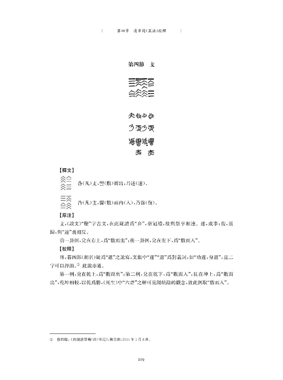 2015年,王化平、周燕先生著有《萬物皆有數(shù):數(shù)字卦與先秦易筮研究》一書,由人民出版社出版,書中除對王先生此前的散篇著述加以整理總結(jié)外,重點補充了《筮法》的研究內(nèi)容,這是在拙文草成之時未曾引及的。2017年,丁四新先生著有《周易溯源與早期易學(xué)考論》一書,由中國人民大學(xué)出版社出版,也是藉助《筮法》等新材料,對相關(guān)易學(xué)問題進(jìn)行了深入探討。在此基礎(chǔ)上,丁先生還先后發(fā)表了兩篇重要文章:《數(shù)字卦研究的階段、貢獻(xiàn)及其終結(jié)》(《周易研究》2018年第5期)和《數(shù)字卦及其相關(guān)概念辨析》(《中國哲學(xué)史》2019年第3期)。前者應(yīng)屬于本書第三章第一節(jié)在數(shù)字卦研究“目前存在的問題及研究前景”中所提到的“數(shù)字卦性質(zhì)的認(rèn)識尚未統(tǒng)一,相關(guān)名稱概念的使用依舊混亂”的問題,丁先生認(rèn)為數(shù)字卦研究有其階段性意義,并應(yīng)逐漸走向終結(jié),這是值得我們進(jìn)一步思考的。后者曾對我作的研究綜述以及關(guān)于數(shù)字卦與卦畫圖形性質(zhì)的劃分,進(jìn)行了批評,這是要十分感謝的。也請大家在閱讀本書相關(guān)章節(jié)時配合參看。